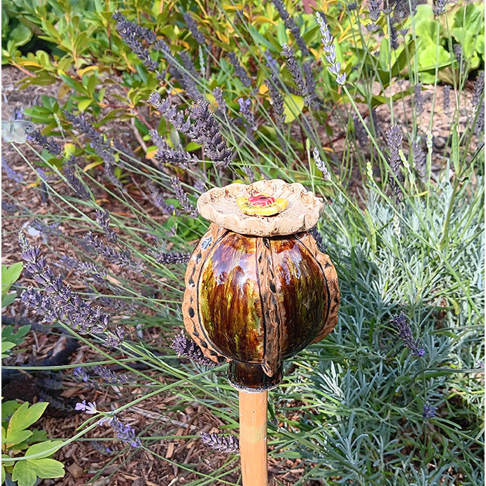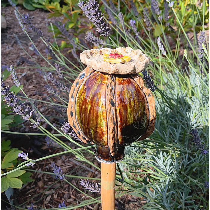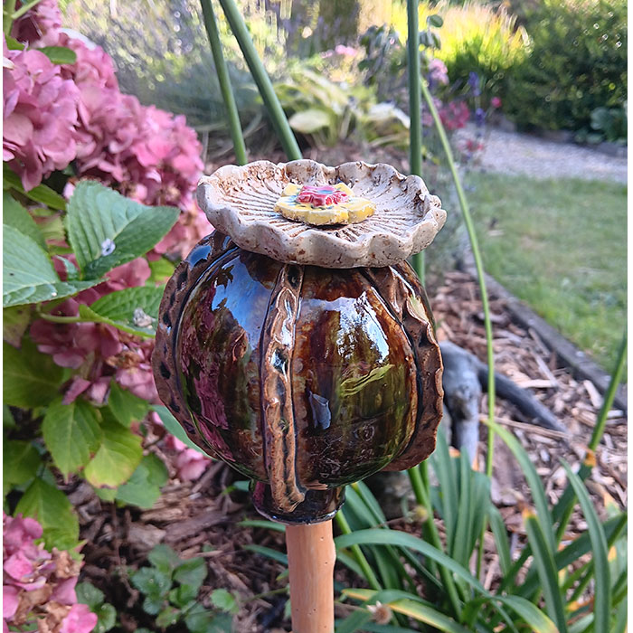 Diese Gartendekoration hat die Form einer Mohnkapsel mit einer kleinen Bienentränke obendrauf.