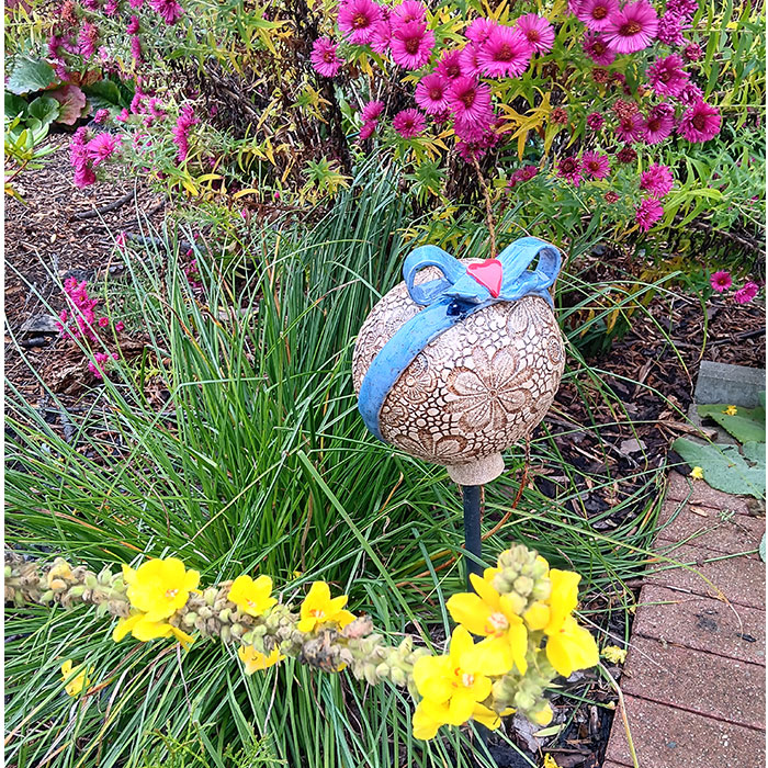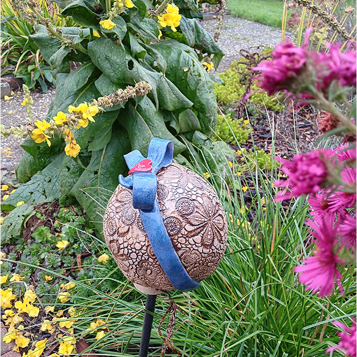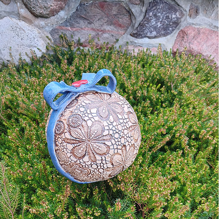 ich eine Schleife rundum gebunden und ein kleines Herzchen drauf gesetzt. Die Kugel wurde frostfest gebrannt und
