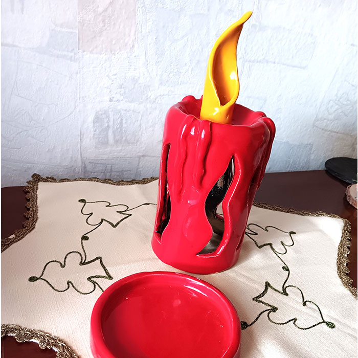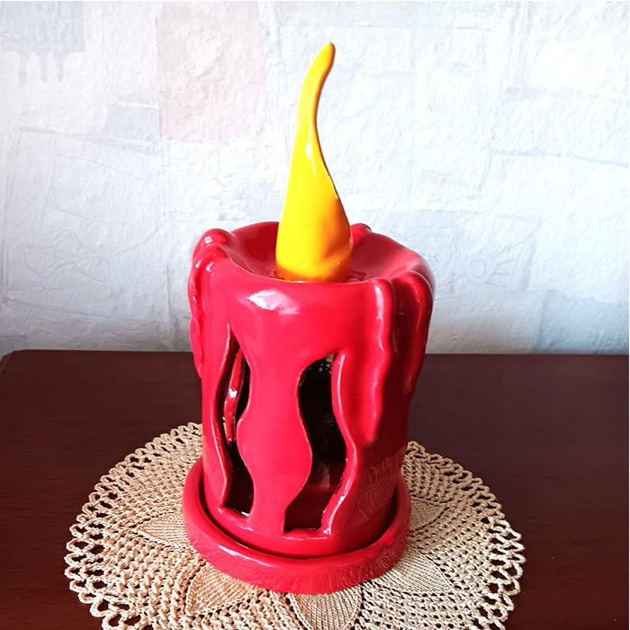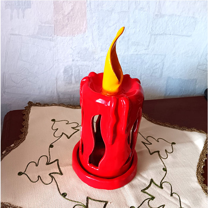 Dieses Windlicht hat die Form und das Aussehen einer Kerze. Sie hat einen extra Unterteller für das Teelicht.